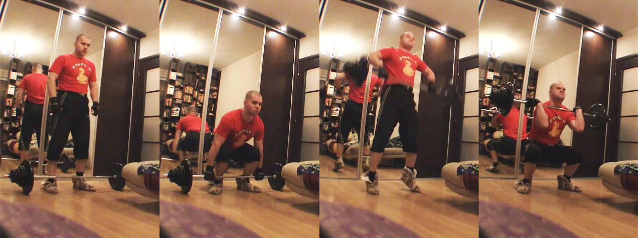 Полуприсед до бёдер паралельных полу, а так я и в стойку на грудь этот вес дёргаю, ваще без подседа, а штангисты в полный проваливаются и на отскоке оттуда вытягивают веса в разы больше. У них рывок и толчок, а у меня просто на грудь закинуть.